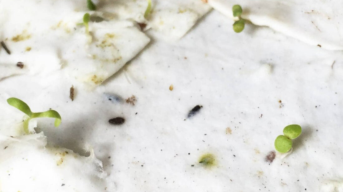 Det finns frön inbäddade i kortet och i beskrivningen kan du se vilka. Lägg kortet under lite jord på en ljus plats och håll den fuktig. Bilden här är efter 6 dagar.